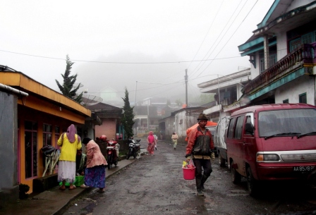 Sekitar pukul 01.00 wib dini hari, saya menginjakkan kaki di perkampungan yang berpenduduk sekitar 3000 jiwa. Suasana didominasi keheningan, sesekali hembusan kabut tebal putih menderu deru. Anda mungkin bisa bayangkan desa ini seperti desa tanpa penghuni. Tak ada suara aktivitas manusia sedikitpun. Tak ada manusia di pos ronda. Begitu pun suara televisi. Kondisi sekitar diterangi lampu neon di pelataran rumah penduduk.